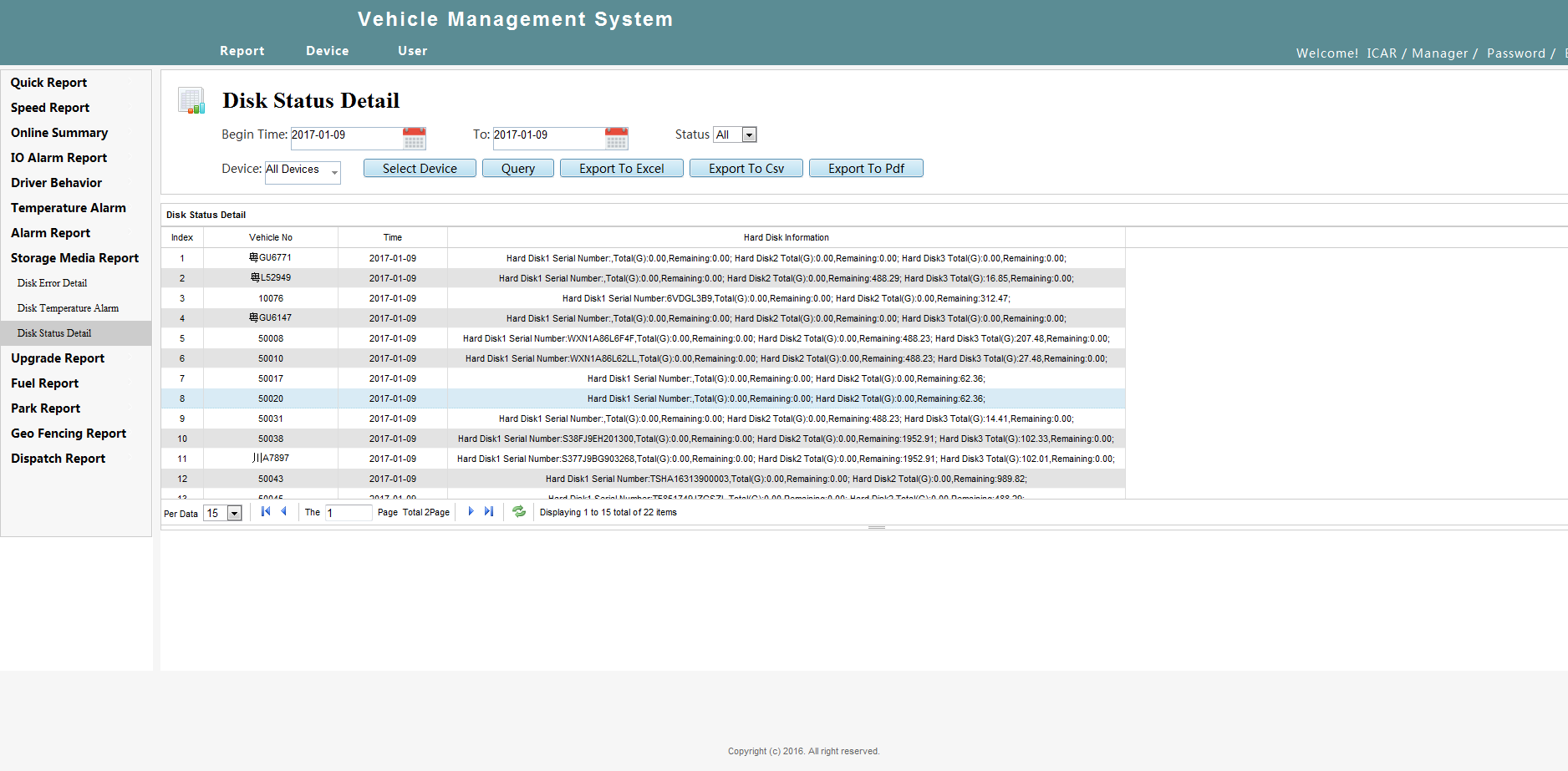 Storage media report consists of Disk Error Detail,Disk Temperature Alarm and Disk Status Detail, to ensure the normal operation of the hard disk and prevent the impact of vehicle video storage caused by hard disk not working properly.