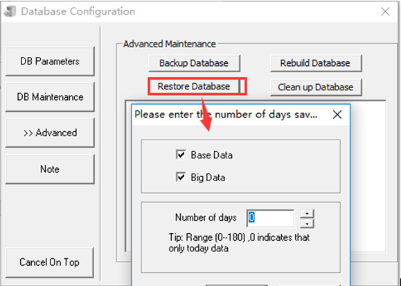 3. Click the Restore Database button, restored process will first check previous backup data in REPAIR folder, if can't find REPAIR folder, there will find parent directory IVMSDBBackup folder to restore, you can choose restore the basic data or big data (it take long time to restore the big data), also can choose the restored days.