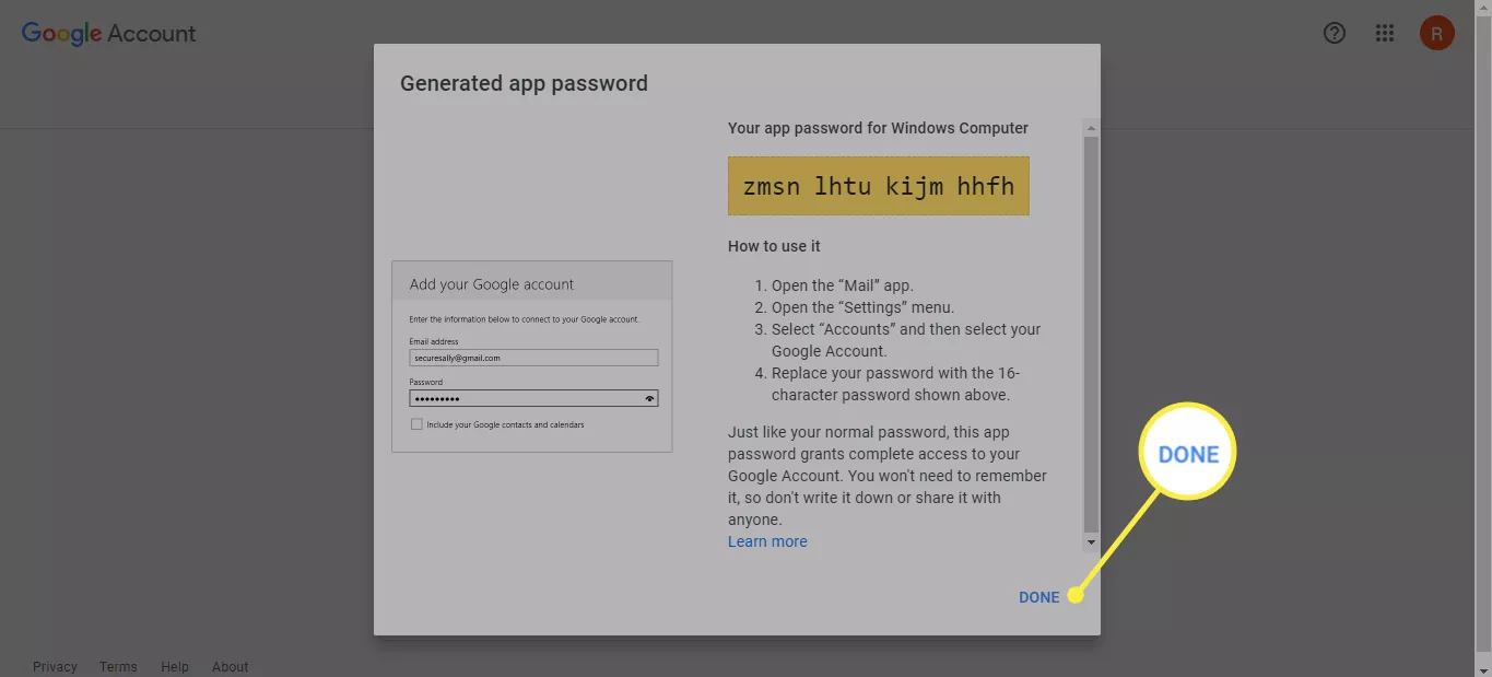 6. Your password appears in a new window. Follow the instructions on the screen to complete the process, and then select DONE.